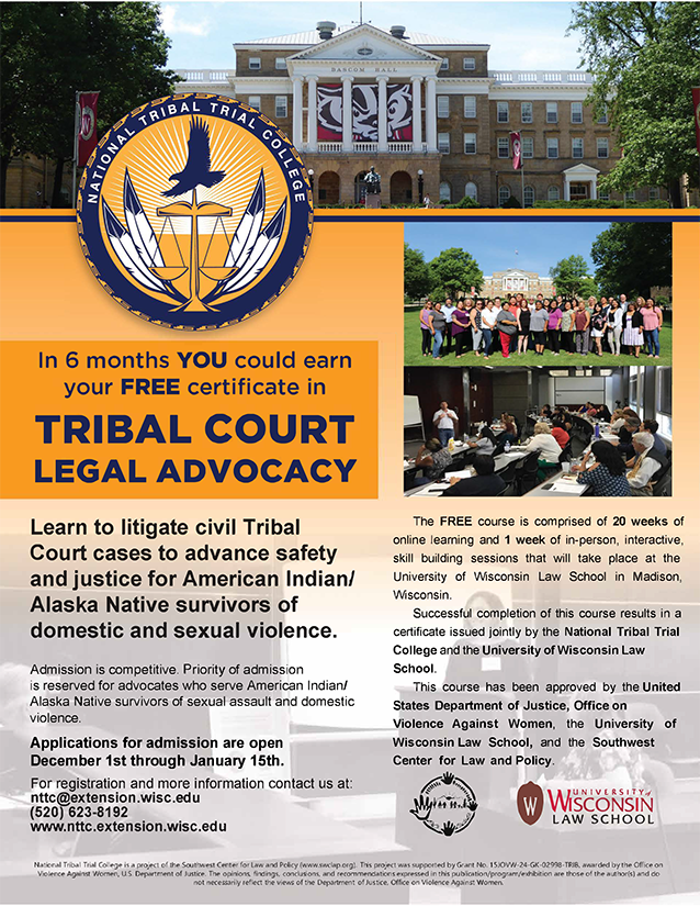 The National Tribal Trial College Certificate in Tribal Court Legal Advocacy is a free, 6-month, skill building course empowering laypersons to practice law in Tribal Courts across the United States of America. More than 300 Tribal Court Legal Advocates representing 108 Tribes from 26 states have completed the intensive litigation Certificate in partnership with the United States Department of Justice, Office on Violence Against Women and the University of Wisconsin Law School.